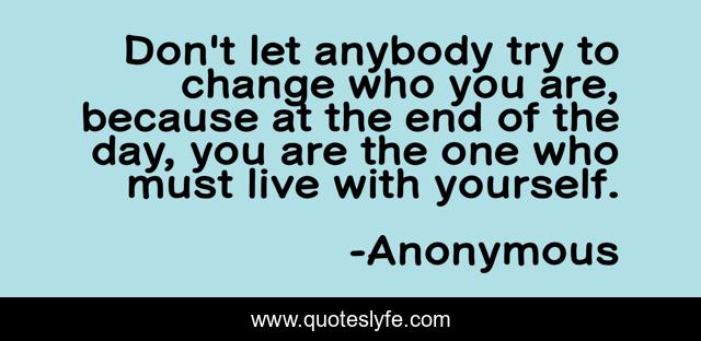 This page presents the quote "Don't let anybody try to change who you are, because at the end of the day, you are the one who must live with yourself.". Author of this quote is Anonymous. This quote is about change, others-opinion, yourself,.