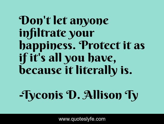 This page presents the quote "Don't let anyone infiltrate your happiness. Protect it as if it's all you have, because it literally is.". Author of this quote is Tyconis D. Allison Ty. This quote is about life, motivation, happiness, inspiration,.