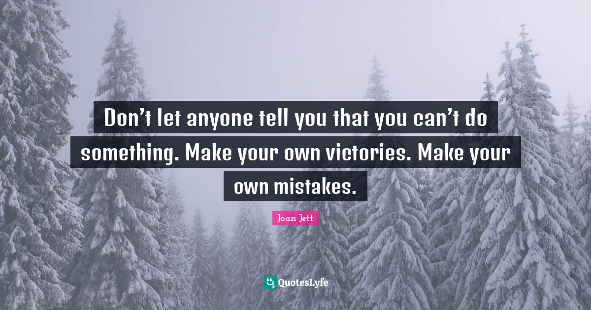 This page presents the quote "Don’t let anyone tell you that you can’t do something. Make your own victories. Make your own mistakes.". Author of this quote is Joan Jett. This quote is about victory, mistake, inspirational music,.
