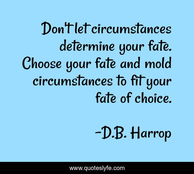 This page presents the quote "Don't let circumstances determine your fate. Choose your fate and mold circumstances to fit your fate of choice.". Author of this quote is D.B. Harrop. This quote is about circumstances, fate, thoughts-on-life,.