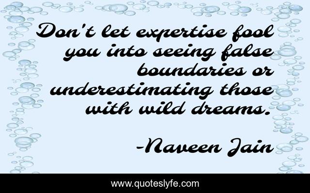 This page presents the quote "Don't let expertise fool you into seeing false boundaries or underestimating those with wild dreams.". Author of this quote is Naveen Jain. This quote is about fool, seeing,.