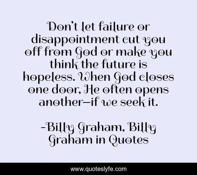 This page presents the quote "Don’t let failure or disappointment cut you off from God or make you think the future is hopeless. When God closes one door, He often opens another—if we seek it.". Author of this quote is Billy Graham, Billy Graham in Quotes. This quote is about disappointment, billy-graham,.