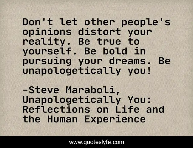 This page presents the quote "Don't let other people's opinions distort your reality. Be true to yourself. Be bold in pursuing your dreams. Be unapologetically you!". Author of this quote is Steve Maraboli, Unapologetically You: Reflections on Life and the Human Experience. This quote is about opinions, be-you, love, success, be-yourself, reality, dreams, happiness, affection,.