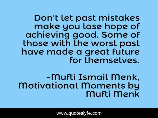This page presents the quote "Don't let past mistakes make you lose hope of achieving good. Some of those with the worst past have made a great future for themselves.". Author of this quote is Mufti Ismail Menk, Motivational Moments by Mufti Menk. This quote is about motivation, past, mistakes, inspirational, enthusiasm, future, hope,.