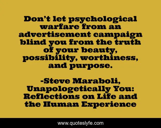 This page presents the quote "Don’t let psychological warfare from an advertisement campaign blind you from the truth of your beauty, possibility, worthiness, and purpose.". Author of this quote is Steve Maraboli, Unapologetically You: Reflections on Life and the Human Experience. This quote is about life, psychological-warfare, beauty, advertisement, possibility, worthiness, purpose, truth, happiness,.