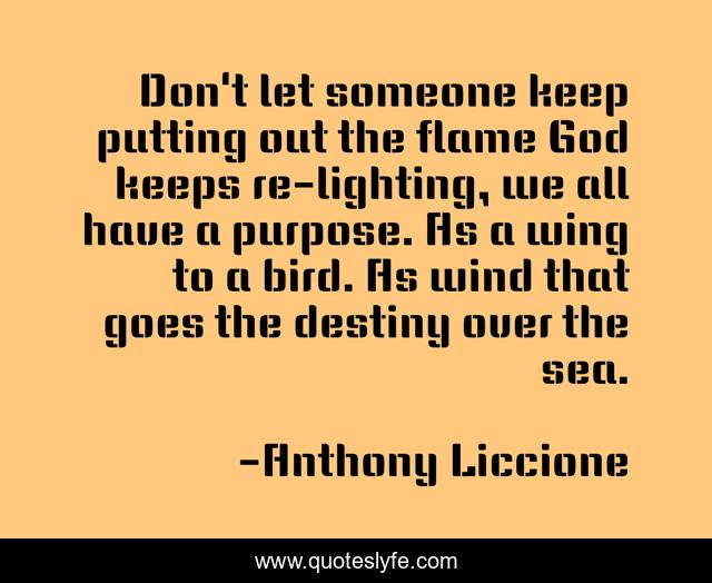 This page presents the quote "Don't let someone keep putting out the flame God keeps re-lighting, we all have a purpose. As a wing to a bird. As wind that goes the destiny over the sea.". Author of this quote is Anthony Liccione. This quote is about fly, break-one-s-dream, discourage, bully, heart, intimidate, god, vex, calling,.