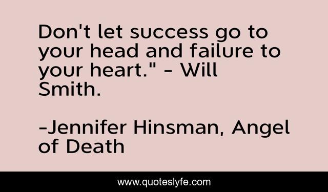 This page presents the quote "Don't let success go to your head and failure to your heart." - Will Smith.". Author of this quote is Jennifer Hinsman, Angel of Death. .