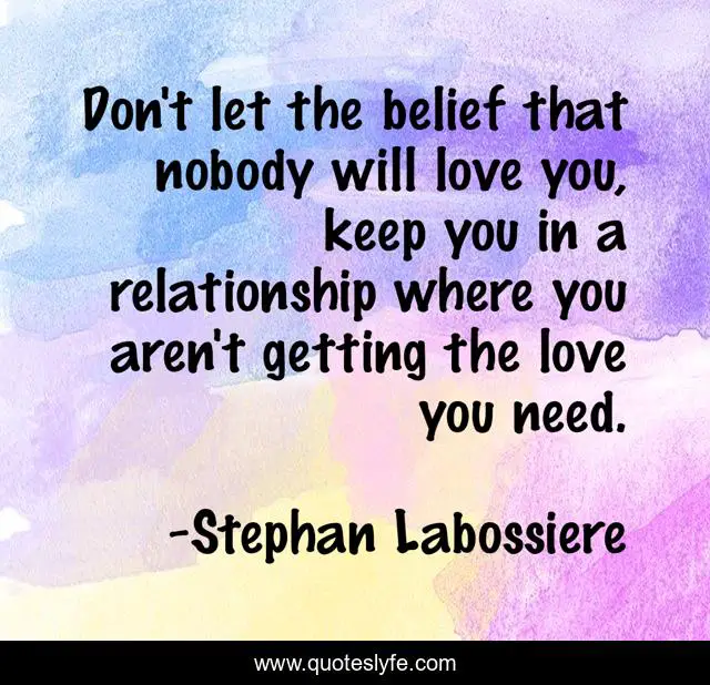 This page presents the quote "Don't let the belief that nobody will love you, keep you in a relationship where you aren't getting the love you need.". Author of this quote is Stephan Labossiere. This quote is about relationships, settling, advice, love, affection,.