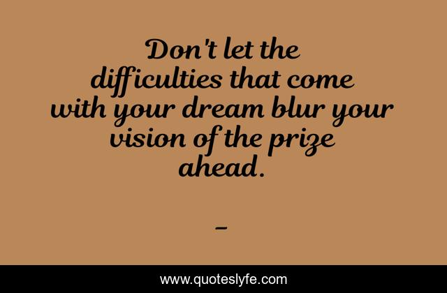 This page presents the quote "Don't let the difficulties that come with your dream blur your vision of the prize ahead.". Author of this quote is . This quote is about edmond-mbiaka, the-difficulties-of-your-dreams, dream, your-vision, focus-on-the-prize-ahead,.