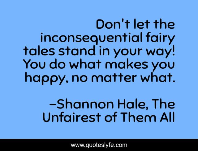 This page presents the quote "Don't let the inconsequential fairy tales stand in your way! You do what makes you happy, no matter what.". Author of this quote is Shannon Hale, The Unfairest of Them All. This quote is about fairy-tales, evil-queen, happiness, happy,.