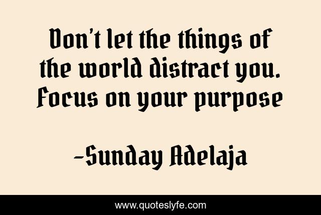 This page presents the quote "Don’t let the things of the world distract you. Focus on your purpose". Author of this quote is Sunday Adelaja. This quote is about discipline, worldly-distractions, life, distractions, finance, money, blessing, focus, avoiding-distractions,.