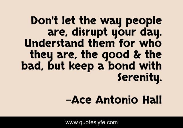 This page presents the quote "Don't let the way people are, disrupt your day. Understand them for who they are, the good & the bad, but keep a bond with Serenity.". Author of this quote is Ace Antonio Hall. .