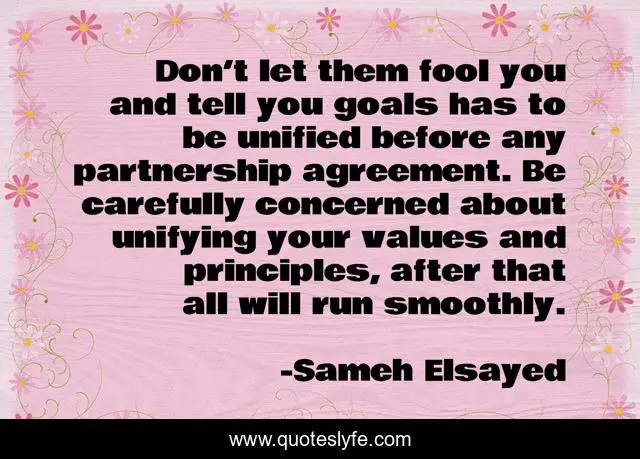 This page presents the quote "Don’t let them fool you and tell you goals has to be unified before any partnership agreement. Be carefully concerned about unifying your values and principles, after that all will run smoothly.". Author of this quote is Sameh Elsayed. This quote is about experience-plus, adam-elsayedtood, partnership, principles, joumana-ezz, noha-abdel-hameed, values, goals, human-development,.