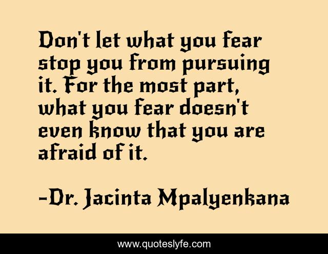 This page presents the quote "Don't let what you fear stop you from pursuing it. For the most part, what you fear doesn't even know that you are afraid of it.". Author of this quote is Dr. Jacinta Mpalyenkana. This quote is about fearless, fear, life-lessons, persistence,.