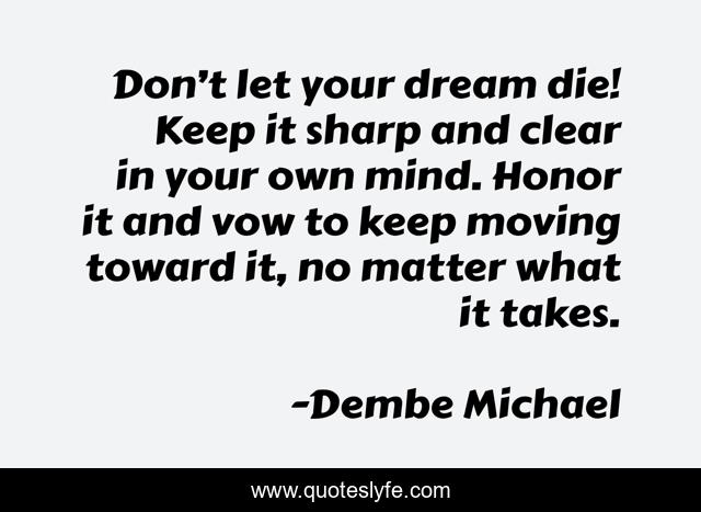 This page presents the quote "Don’t let your dream die! Keep it sharp and clear in your own mind. Honor it and vow to keep moving toward it, no matter what it takes.". Author of this quote is Dembe Michael. .