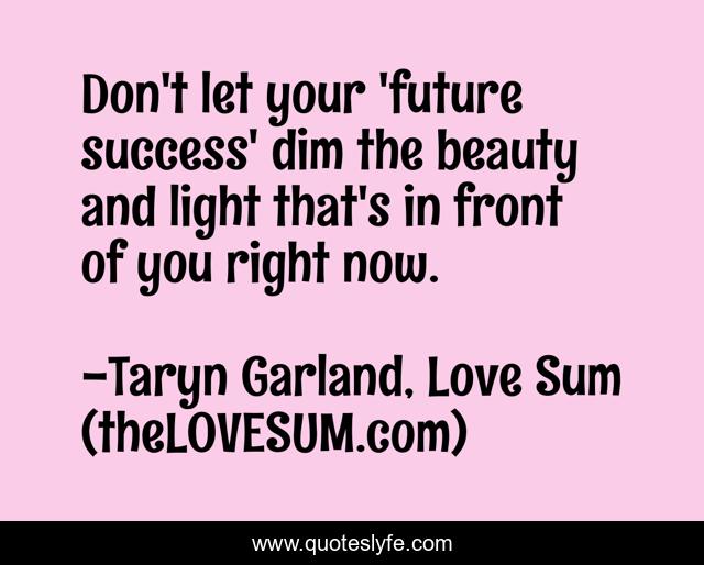 This page presents the quote "Don't let your 'future success' dim the beauty and light that's in front of you right now.". Author of this quote is Taryn Garland, Love Sum (theLOVESUM.com). This quote is about gratitude, success, present-moment, inspirational, enthusiasm, present,.