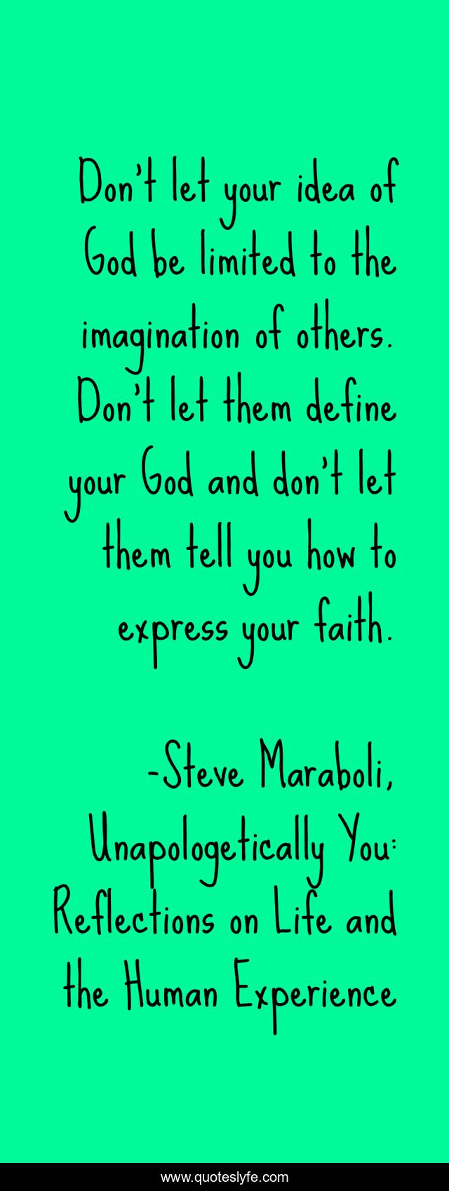 This page presents the quote "Don’t let your idea of God be limited to the imagination of others. Don’t let them define your God and don’t let them tell you how to express your faith.". Author of this quote is Steve Maraboli, Unapologetically You: Reflections on Life and the Human Experience. This quote is about imagination, god, faith,.