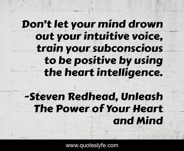 This page presents the quote "Don’t let your mind drown out your intuitive voice, train your subconscious to be positive by using the heart intelligence.". Author of this quote is Steven Redhead, Unleash The Power of Your Heart and Mind. This quote is about heart, confidence, intuitive, positive, mind, subconscious, intelligence,.