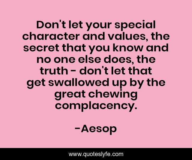 This page presents the quote "Don't let your special character and values, the secret that you know and no one else does, the truth - don't let that get swallowed up by the great chewing complacency.". Author of this quote is Aesop. This quote is about independent-thought, individuality, values, morals, self-expression,.