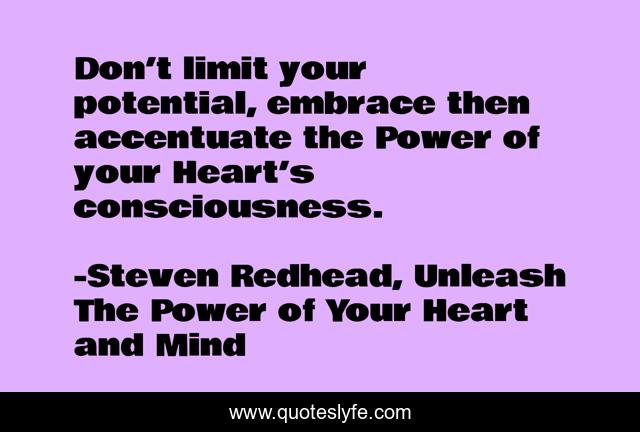 This page presents the quote "Don’t limit your potential, embrace then accentuate the Power of your Heart’s consciousness.". Author of this quote is Steven Redhead, Unleash The Power of Your Heart and Mind. This quote is about power-of-the-heart, accentuate, embrace, potential, consciousness,.