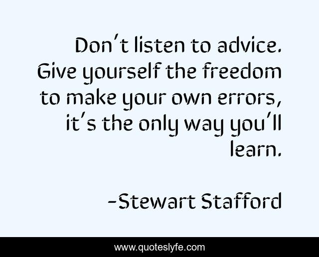 This page presents the quote "Don’t listen to advice. Give yourself the freedom to make your own errors, it’s the only way you’ll learn.". Author of this quote is Stewart Stafford. This quote is about advice, mistakes-we-make, learning,.