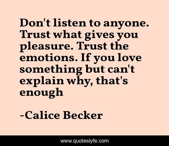 This page presents the quote "Don't listen to anyone. Trust what gives you pleasure. Trust the emotions. If you love something but can't explain why, that's enough". Author of this quote is Calice Becker. This quote is about pleasure, trust, emotions,.