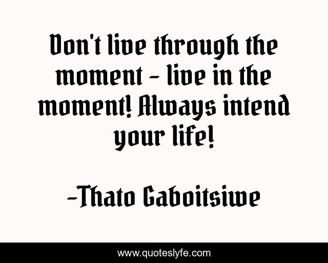 This page presents the quote "Don't live through the moment - live in the moment! Always intend your life!". Author of this quote is Thato Gaboitsiwe. This quote is about inspirational-life, motivation, life-lessons, inspiration,.
