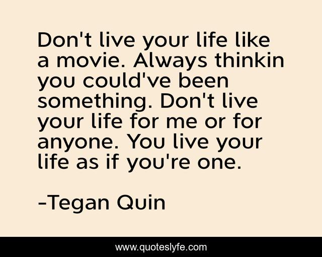 This page presents the quote "Don't live your life like a movie. Always thinkin you could've been something. Don't live your life for me or for anyone. You live your life as if you're one.". Author of this quote is Tegan Quin. This quote is about you-could-ve-been-something, advice, tegan-and-sara, divided, live-your-life-as-if-you-re-one,.
