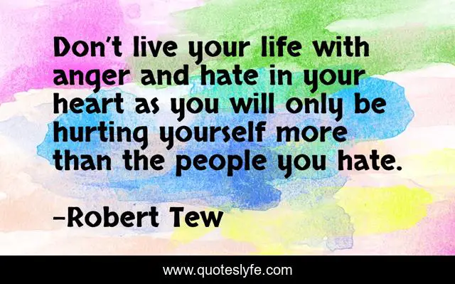 This page presents the quote "Don’t live your life with anger and hate in your heart as you will only be hurting yourself more than the people you hate.". Author of this quote is Robert Tew. This quote is about anger, pain, hurt,.