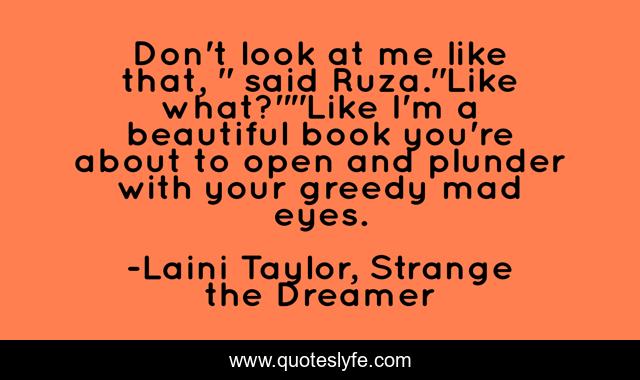 This page presents the quote "Don't look at me like that, " said Ruza."Like what?""Like I'm a beautiful book you're about to open and plunder with your greedy mad eyes.". Author of this quote is Laini Taylor, Strange the Dreamer. This quote is about books, reading,.