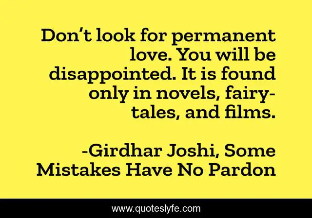 This page presents the quote "Don’t look for permanent love. You will be disappointed. It is found only in novels, fairy-tales, and films.". Author of this quote is Girdhar Joshi, Some Mistakes Have No Pardon. This quote is about fairy-tales, love, affection,.