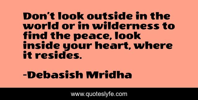 This page presents the quote "Don’t look outside in the world or in wilderness to find the peace, look inside your heart, where it resides.". Author of this quote is Debasish Mridha. This quote is about life, love, knowledge, inspirational, intelligence, philosophy, wisdom, quotes, affection,.