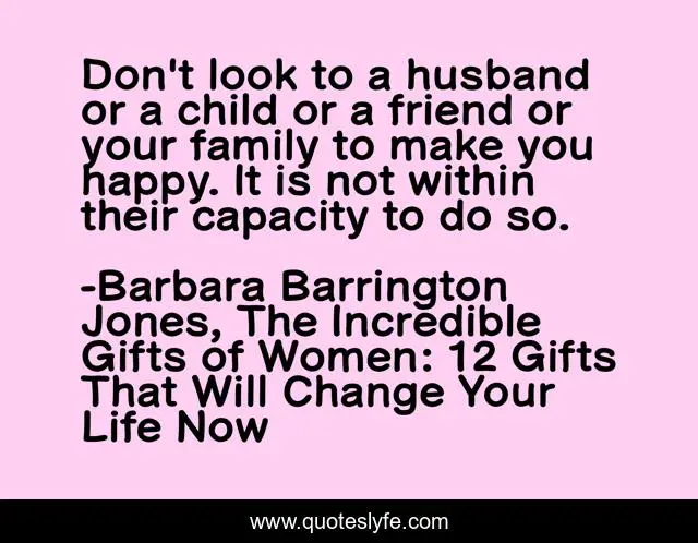 This page presents the quote "Don't look to a husband or a child or a friend or your family to make you happy. It is not within their capacity to do so.". Author of this quote is Barbara Barrington Jones, The Incredible Gifts of Women: 12 Gifts That Will Change Your Life Now. .