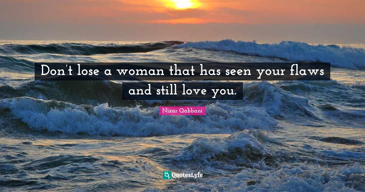 This page presents the quote "Don’t lose a woman that has seen your flaws and still love you.". Author of this quote is Nizar Qabbani. This quote is about stills, flaws, still love you, love you,.