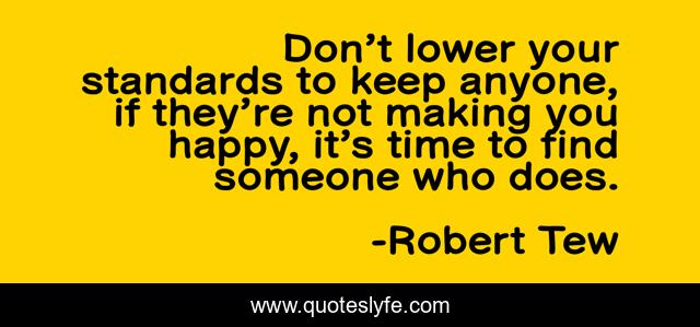 This page presents the quote "Don’t lower your standards to keep anyone, if they’re not making you happy, it’s time to find someone who does.". Author of this quote is Robert Tew. This quote is about love, relationship, value, self-worth, standards, worth, affection,.