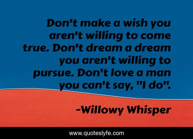 This page presents the quote "Don't make a wish you aren't willing to come true. Don't dream a dream you aren't willing to pursue. Don't love a man you can't say, "I do".". Author of this quote is Willowy Whisper. This quote is about love, wishes, marriage, dreams, affection,.