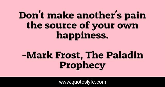 This page presents the quote "Don't make another's pain the source of your own happiness.". Author of this quote is Mark Frost, The Paladin Prophecy. This quote is about right-and-wrong, good-and-evil,.
