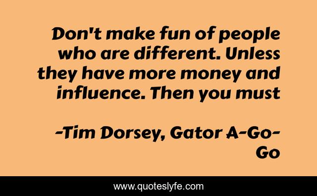 This page presents the quote "Don't make fun of people who are different. Unless they have more money and influence. Then you must". Author of this quote is Tim Dorsey, Gator A-Go-Go. .