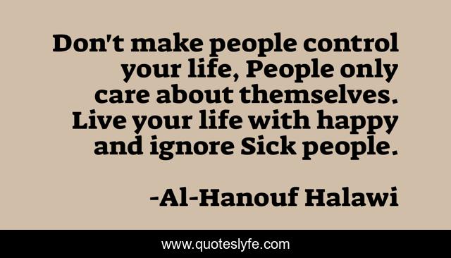 This page presents the quote "Don't make people control your life, People only care about themselves. Live your life with happy and ignore Sick people.". Author of this quote is Al-Hanouf Halawi. This quote is about control, life, happy,.