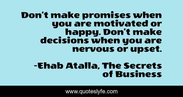 This page presents the quote "Don’t make promises when you are motivated or happy. Don’t make decisions when you are nervous or upset.". Author of this quote is Ehab Atalla, The Secrets of Business. This quote is about entrepreneur, entrepreneurial, business, entrepreneurship,.