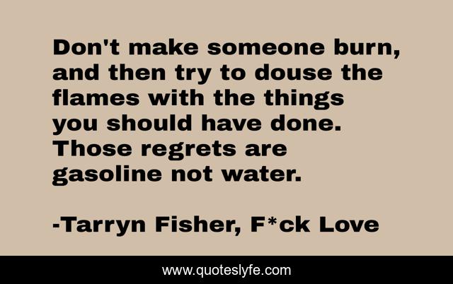 This page presents the quote "Don't make someone burn, and then try to douse the flames with the things you should have done. Those regrets are gasoline not water.". Author of this quote is Tarryn Fisher, F*ck Love. .
