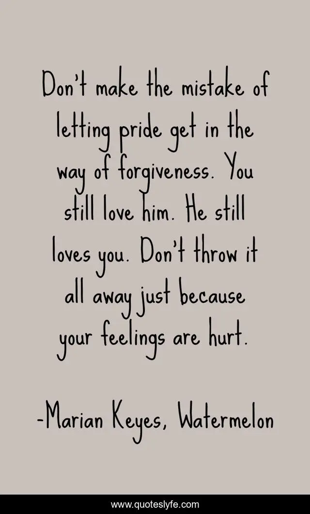 This page presents the quote "Don't make the mistake of letting pride get in the way of forgiveness. You still love him. He still loves you. Don't throw it all away just because your feelings are hurt.". Author of this quote is Marian Keyes, Watermelon. This quote is about cheat, betrayal, love, affection, fling,.