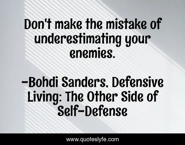 This page presents the quote "Don't make the mistake of underestimating your enemies.". Author of this quote is Bohdi Sanders, Defensive Living: The Other Side of Self-Defense. This quote is about enemy, enemies-trap, enemies-and-opposition, bohdi-sanders, enemies-and-friends, enemies,.