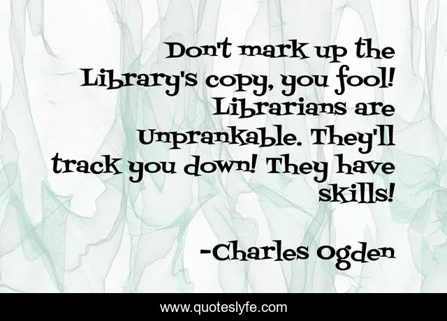 This page presents the quote "Don't mark up the Library's copy, you fool! Librarians are Unprankable. They'll track you down! They have skills!". Author of this quote is Charles Ogden. This quote is about libraries, librarians, books,.
