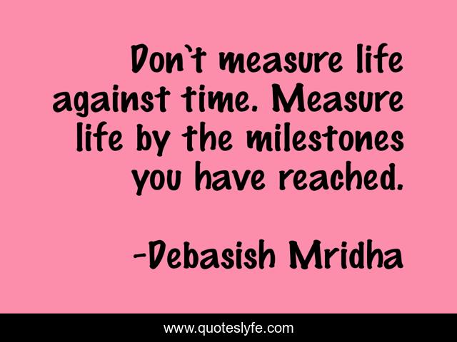 This page presents the quote "Don’t measure life against time. Measure life by the milestones you have reached.". Author of this quote is Debasish Mridha. This quote is about measure-life, philosophy, debasish-mridha, quotes, milestones-in-life, debasish-mridha-md, inspirational, how-to-measure-your-life, enthusiasm,.