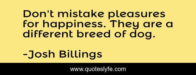 This page presents the quote "Don't mistake pleasures for happiness. They are a different breed of dog.". Author of this quote is Josh Billings. .