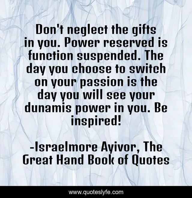 "Israelmore Ayivor, The Great Hand Book of Quotes Quotes." Quoteslyfe.com, 2025. Mon. 08 Dec. 2025. <https://www.quoteslyfe.com/quote/Don-t-neglect-the-gifts-in-you-89007>.