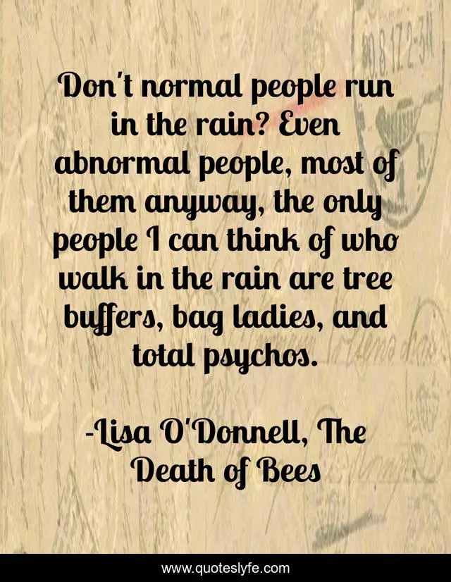 This page presents the quote "Don't normal people run in the rain? Even abnormal people, most of them anyway, the only people I can think of who walk in the rain are tree buffers, bag ladies, and total psychos.". Author of this quote is Lisa O'Donnell, The Death of Bees. This quote is about psychos, rain,.