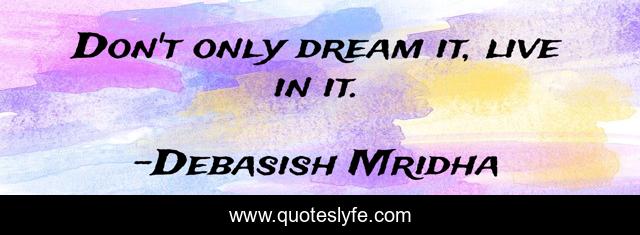 This page presents the quote "Don't only dream it, live in it.". Author of this quote is Debasish Mridha. This quote is about philosophy, debasish-mridha, quotes, live-your-dream, debasish-mridha-md, inspirational, enthusiasm, dream, live-it,.