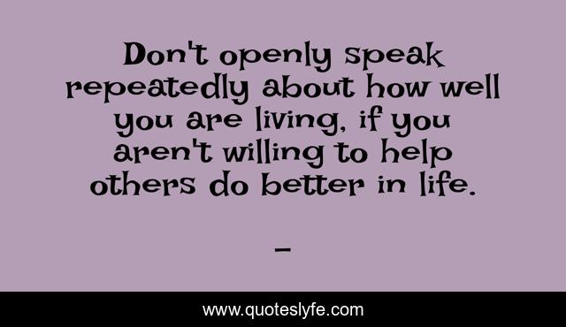 This page presents the quote "Don't openly speak repeatedly about how well you are living, if you aren't willing to help others do better in life.". Author of this quote is . This quote is about helping, edmond-mbiaka, living-well, help-other-do-better-in-life, help-others, extend-a-helping-hand,.